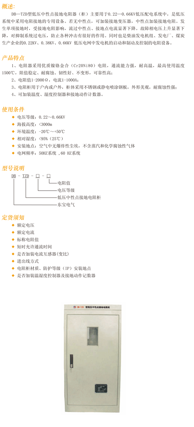产品名称:DB-TZD低压中性点接地电阻柜